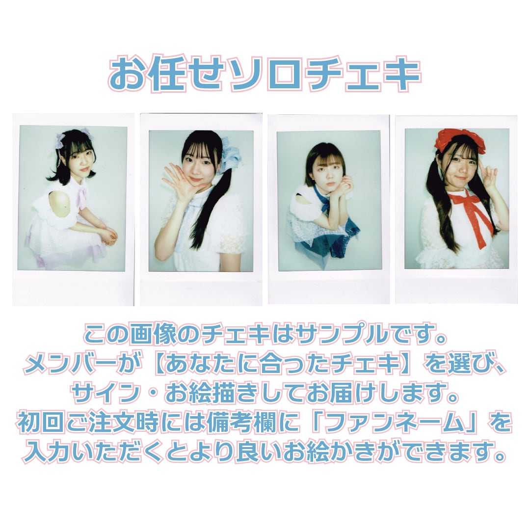 「お任せソロチェキ」は、メンバー本人があなたに合わせて絵柄を選んで、サイン・お絵描きをしてお届けするソロチェキです。ご購入者さまが絵柄を選べない点はランチェキと同じですが、ランダム選択ではなくメンバー本人が図柄を選ぶ点が異なります。ご注文時の『備考欄』にファンネームを入力いただくと選択の精度が上がります。オンラインショップ限定商品です。